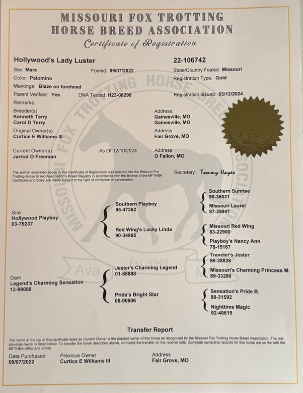 This filly was easy from the start. Has 45 days of groundwork foundation. Didn't even notice when she was saddled. Stands to mount and rides off with no hesitation. Clips, loads, no problem to shoe. Will finish with walk, running walk and natural foxtrot.